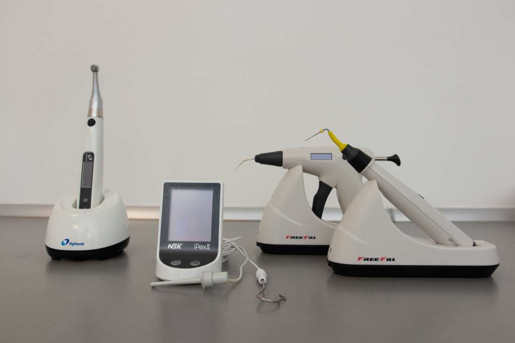 FreeFill root canal obturation system – once prepared, the root canals are then filled with a biocompatible material, the gutta-percha. The machine uses the heat condensation technique of the gutta-percha, the most efficient method of filling. Compared to other root obturation techniques, vertical compaction of the heated guttapercha most commonly involves filling of the lateral channels and apical sealing which cannot be achieved by other methods. Advantages of the hot vertical obturation technique: it has long term clinical success, the sealing of the endodontic canal system is more efficient than with other methods of obturation, a better sealing of the canal obturation is obtained, on which the success of the treatment depends. It is superior to other methods, due to the introduction into the root canals of the heated guttapercha, which can penetrate also into the lateral canals.